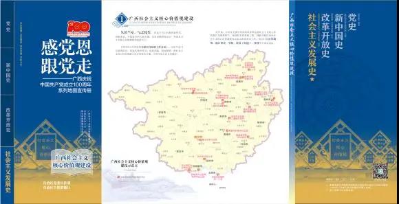 《感党恩 跟党走——广西庆祝中国共产党成立100周年系列地图宣传册》由党史、新中国史、改革开放史、社会主义发展史4个篇章构成。目前已编印完成4册:党在广西的历史进程(一)、党在广西的历史进程(二)、广西民族团结、广西文化旅游各2.5万册,已在自治区党委宣传部及广西自然资源厅主办的多项学习宣传活动中使用。